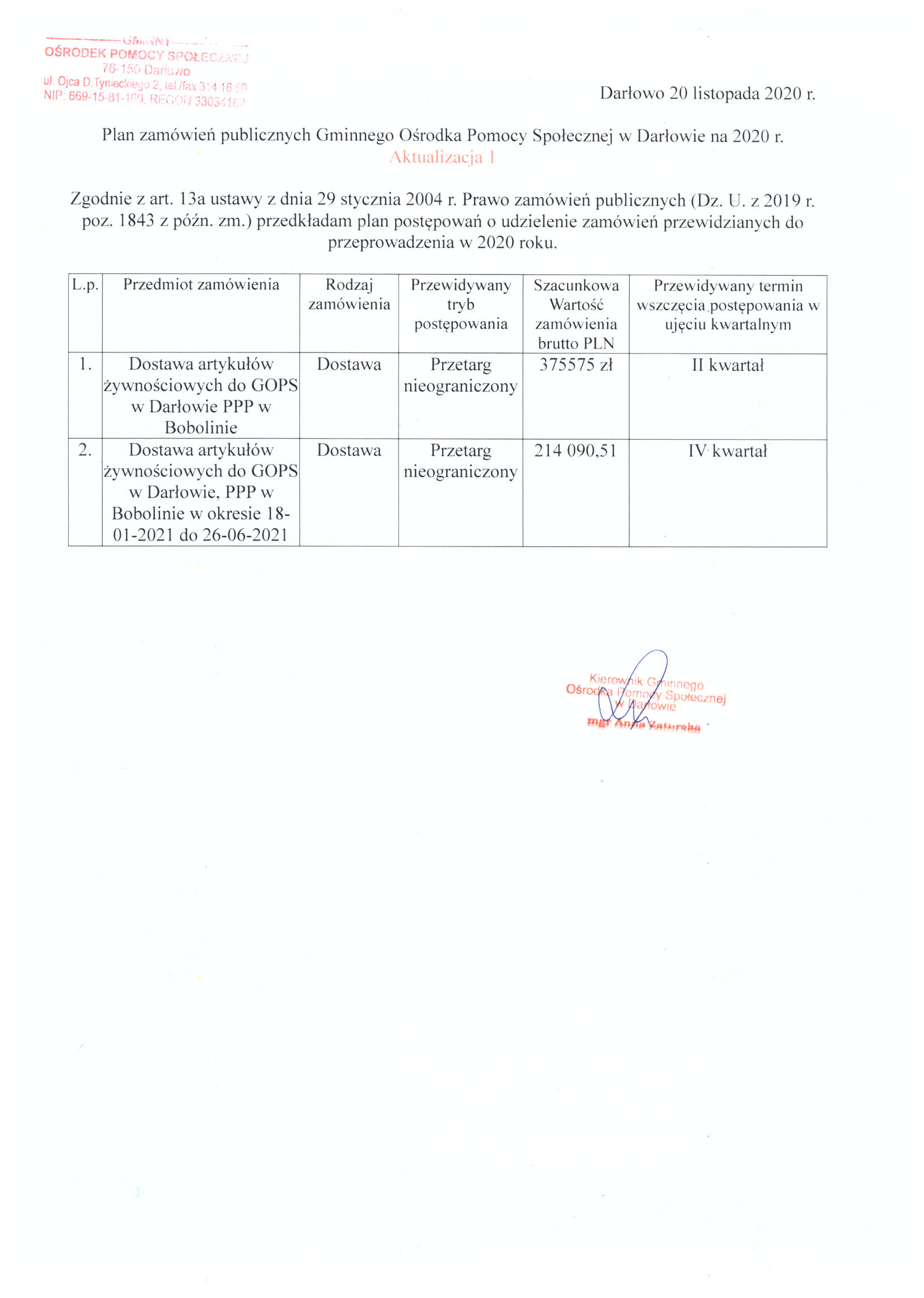 Plan zamówień 2020 - Aktualizacja 1